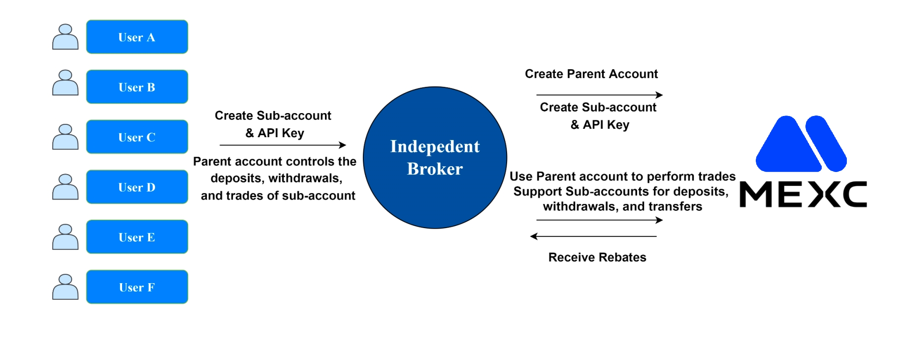 This includes wallet platforms, market data platforms, aggregation trading platforms, stockbrokers, as well as stock and securities trading platforms, etc., all of which have their own independent users. MEXC can provide order matching systems, account management systems, settlement systems, as well as main and sub-account systems, etc. Independent brokers can share the trading fluidity and depth over the MEXC platform and receive profit shares from fees.