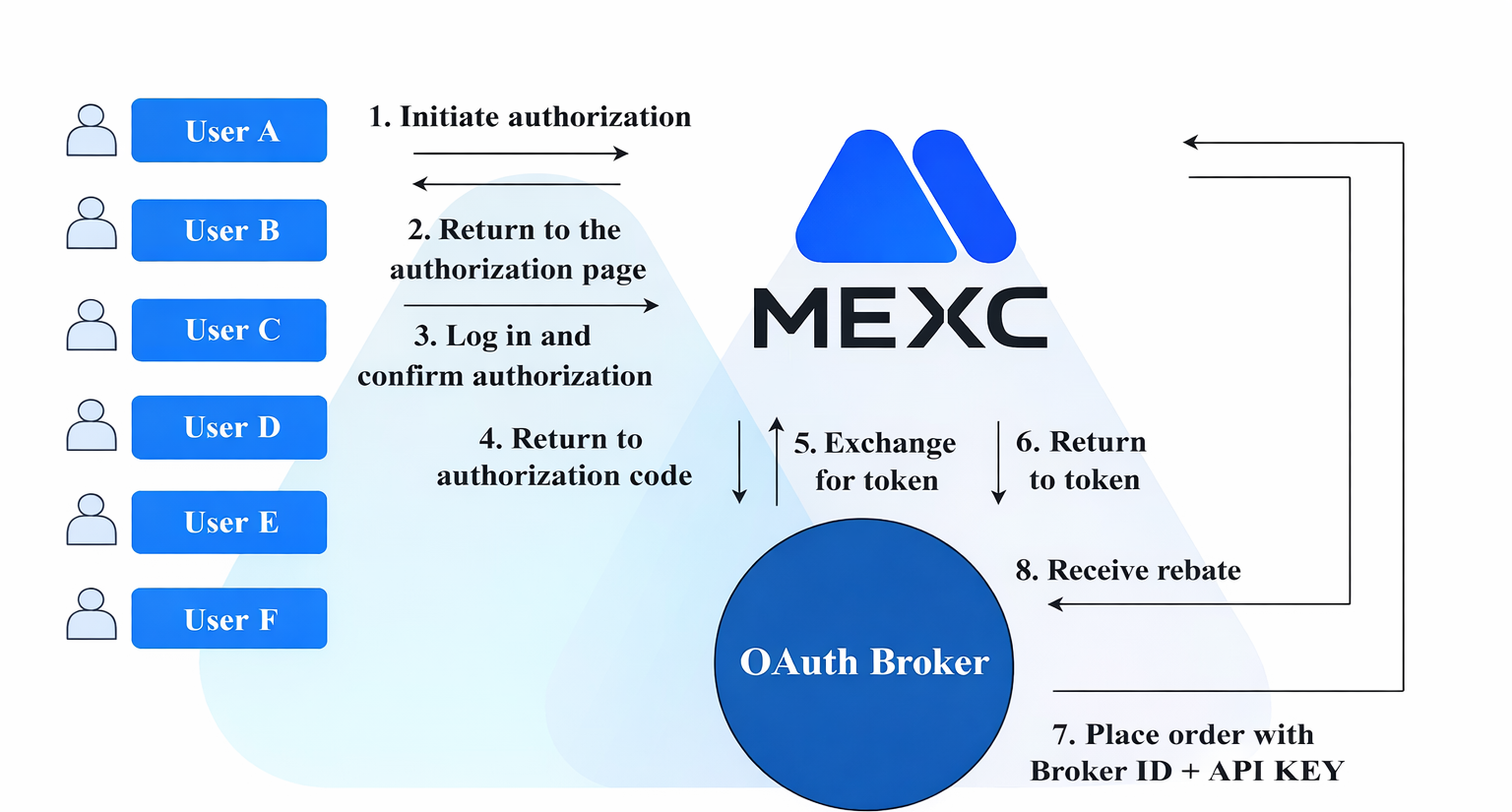 The user signs up at MEXC, applies for API Key in MEXC, and provides it to the broker.