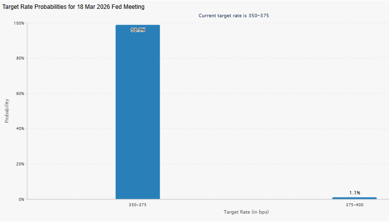 • The Federal Reserve is expected to hold interest rates at 3.5%-3.75%, with 98.8% probability.