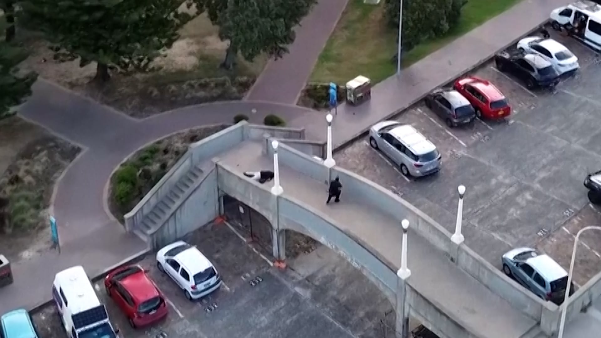 Un video filmado con un dron durante el ataque terrorista del domingo en la playa de Bondi de Sídney capturó la dramática secuencia en la que uno de los tiradores cae al suelo en un puente mientras la policía respondía al tiroteo que dejó al menos 11 muertos.