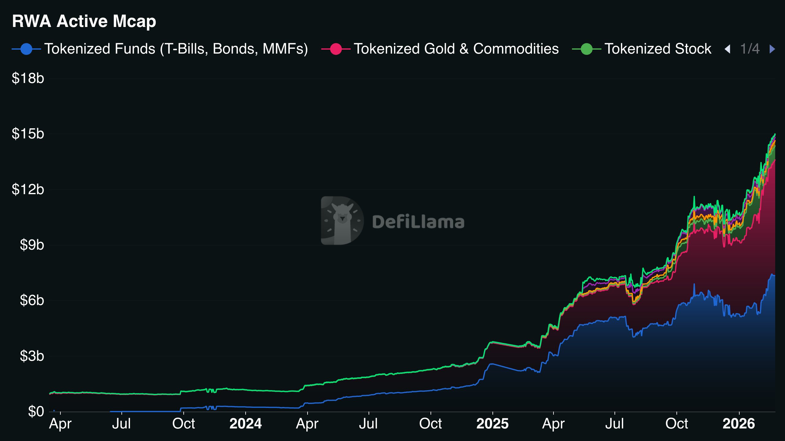 La capitalisation active du marché RWA a franchi cette semaine les 15 milliards de dollars pour la première fois, selon DefiLlama. La capitalisation active suit les token distribués à des détenteurs indépendants ou à des contrats intelligents. Du capital réel dans de véritables portefeuilles, adossé à des actifs du monde réel on-chain.