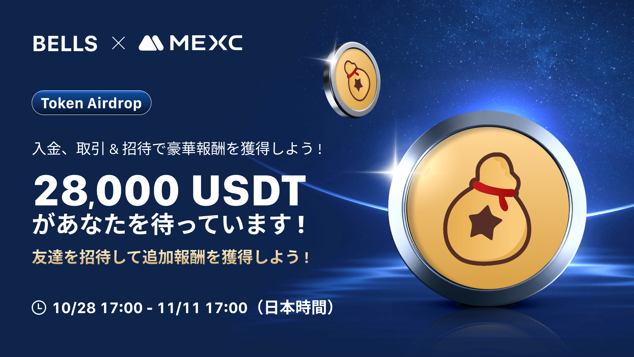 Bellscoin(BELLS)の上場を記念して、MEXCはすべてのMEXCユーザー様を対象に、28,000USDTの報酬が手に入る限定イベントを開催いたします!イベントの詳細は以下の通りです。