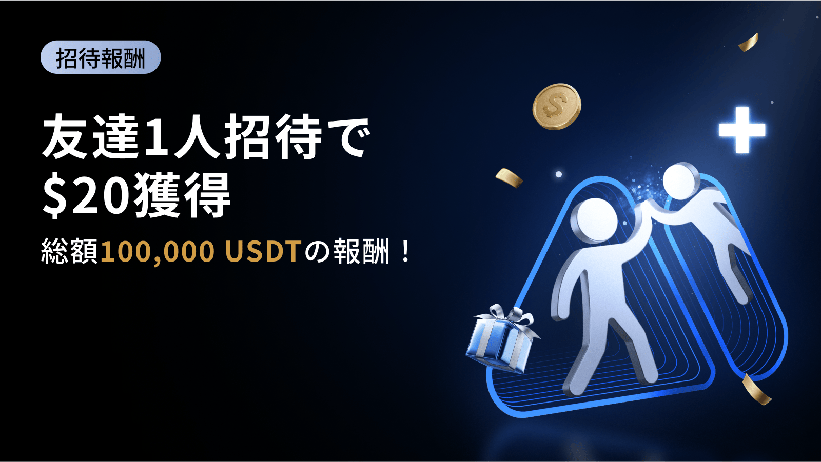 MEXC招待プログラムに参加して、友達を招待し、新規登録と取引をしてもらうだけで、あなたにもお友達にも20 USDTの先物ボーナスがプレゼントされます!
