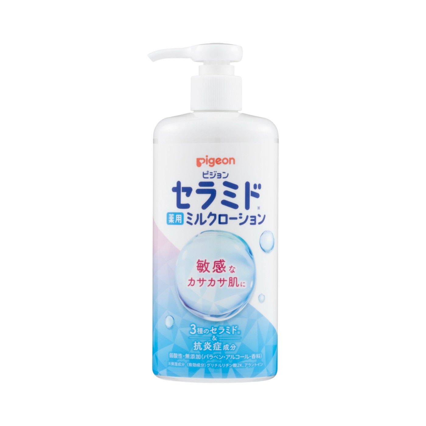 ピジョンの「薬用セラミドミルクローション」は、保湿成分である3種類のセラミドと2種類の有効成分を配合したベビーローション。薬用スキンケアで、敏感肌の赤ちゃんの肌荒れを防ぐと謳っています。弱酸性で、パラベン・アルコール・香料不使用の処方です。ベタつきにくく肌なじみが良い使用感で、多くのモニターから高評価を獲得。また、ほぼ無臭で匂いの不快感も少なく、香りに敏感な人にもおすすめです。成分表を見ると、敏感肌に刺激となりうる成分は見当たらないうえ、肌荒れ防止有効成分としてグリチルリチン酸ジカリウム・アラントインを配合。赤ちゃんのデリケートな肌にも使いやすいでしょう。水分増加量の検証でも高評価に。塗布直後はうるおいを感じられるでしょう。ただし、水分キープ率は控えめだったため、乾燥が気になる季節はこまめな塗り直しが必要です。とはいえ、香りが気になりにくく、赤ちゃんでも使いやすい成分構成のベビーローションがほしい人には候補になる商品です。