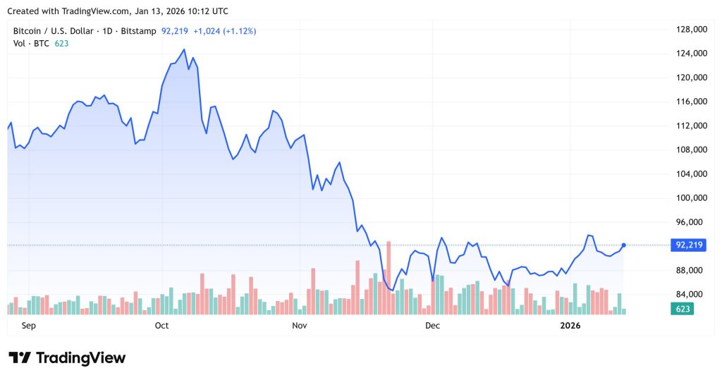 At the time of writing on Tuesday, Bitcoin was trading near $92,200, after posting a strong intraday rebound. The price spent much of the prior session consolidating before pushing higher, climbing from an intraday low near $91,100 to a session high around $92,350. Momentum has cooled slightly since, but price remains supported above the $92,000 level.