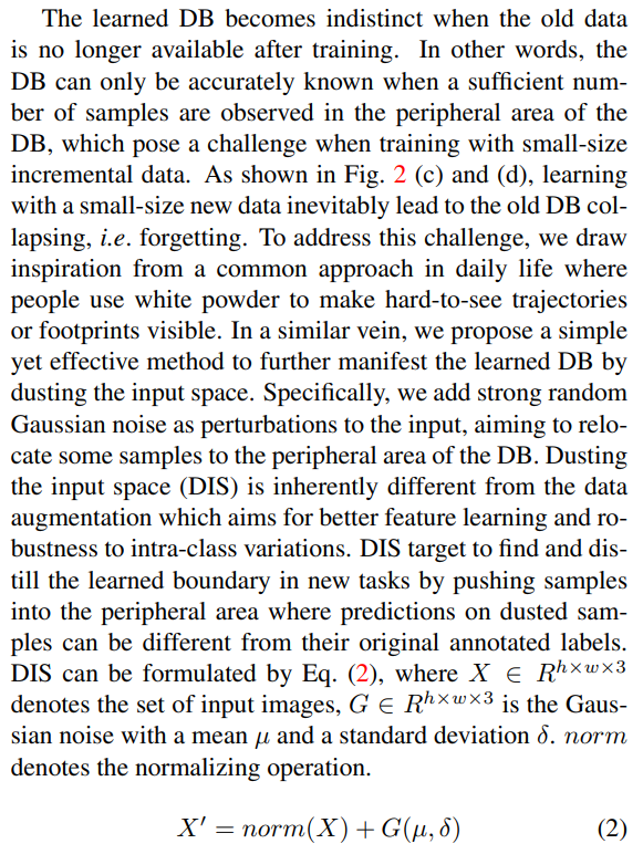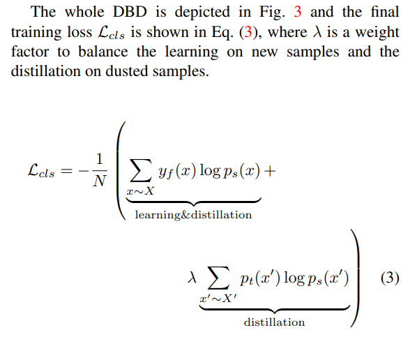\ To address the inter-class interference, we propose to learn the new data by fusing annotated one-hot labels with predictions of existing model, as show in Eq. (1). For new outer samples, learning with fused labels retains the knowledge on none-target classes and extends the decision boundary more moderately to enclose them. Knowledge of nonetarget classes is crucial for retain learned knowledge, which also reported by Mittal et al. [18] in using super-class labels. For new inner samples, keeping the DB around it is a safer choice, i.e. using existing predicted scores as the learning target. However, we propose to push the DB away from the new peripheral inner samples by sharpening the teacher’s prediction score with the one-hot label, which in essence enlarges the inter-class distance while retaining the DB. Hence, although with different motivation, training on new outer samples and new inner samples are unified through the fused label.