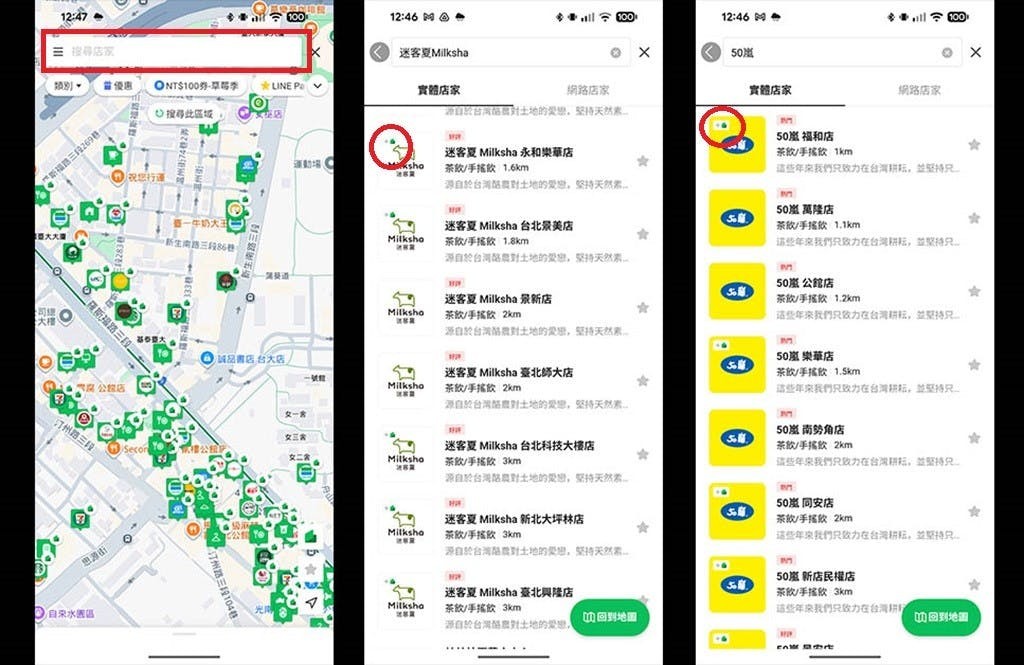▲用戶在「好康地圖」上方欄位搜尋指定品牌,支援Line Pay Money的分店也會有圖示標註。