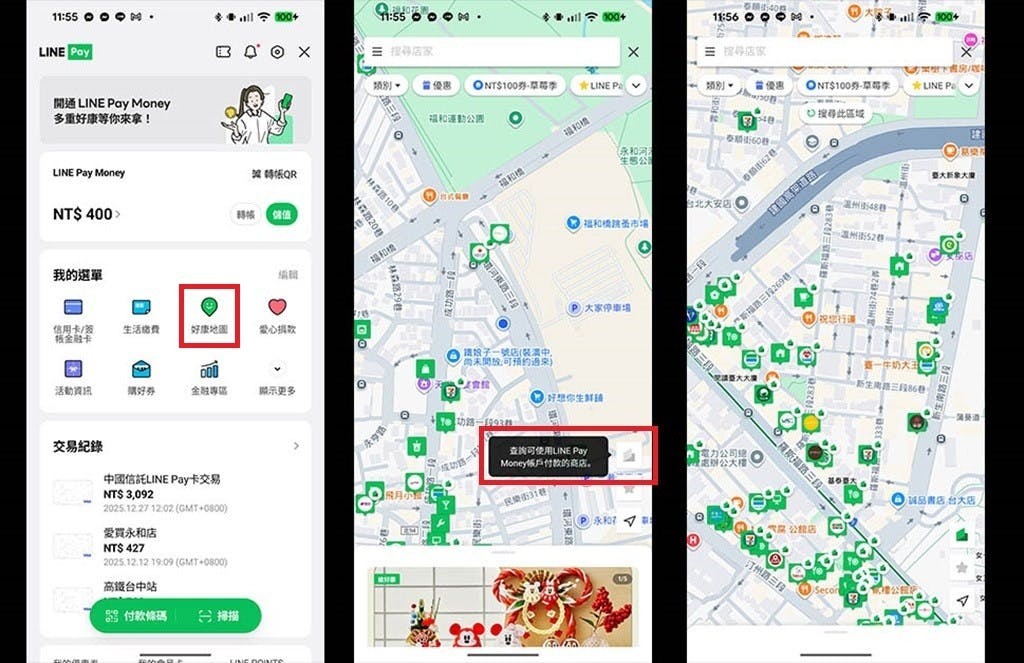 ▲用戶點選Line Pay的「好康地圖」即可查詢支援Line Pay消費的店家。用戶在進入地圖後,點選右側的錢包圖示,即可篩選出同時支援Line Pay和Line Pay Money消費的通路。
