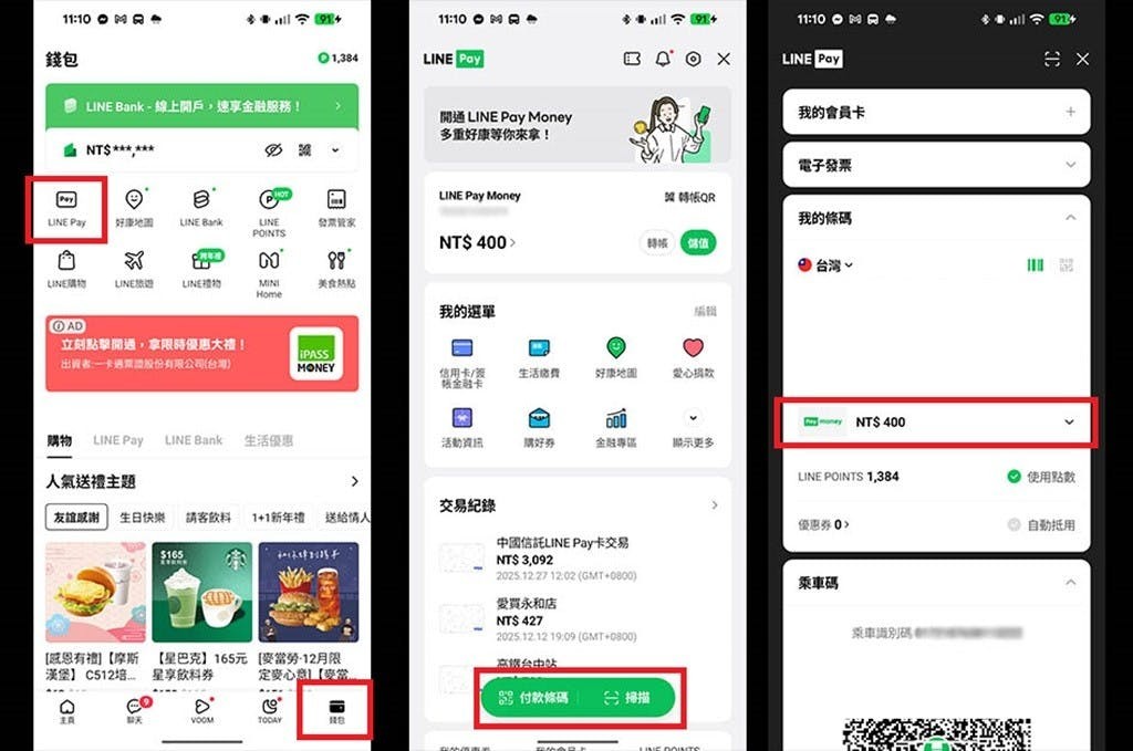 ▲用戶前往Line裡面的「錢包」欄位,選擇「Line Pay」即可找到Line Pay Money儲值和轉帳功能。點選下方的「付款碼」即可付款,在支援Line Pay Money支付的店家選擇Line Pay Money餘額消費。