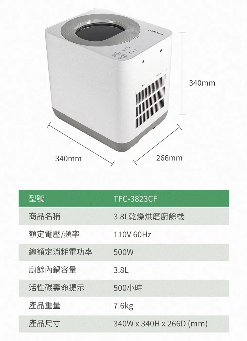 大同這款TFC-3823CF是加熱乾燥型廚餘機,廚餘丟進去後,會加熱除去水分讓它變成像是咖啡粉的碳化廚餘,加熱過程中多少會有味道,因此廚餘機有活性碳濾網用於除臭,這活型碳耗材價格約為547元。乾燥後的廚餘可隨垃圾丟棄,或是當成肥料養植物。
