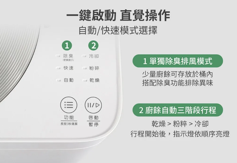 ▲廚餘機使用方式簡單,按個鍵就能使用,而且不用擔心產生蒼蠅或細菌。