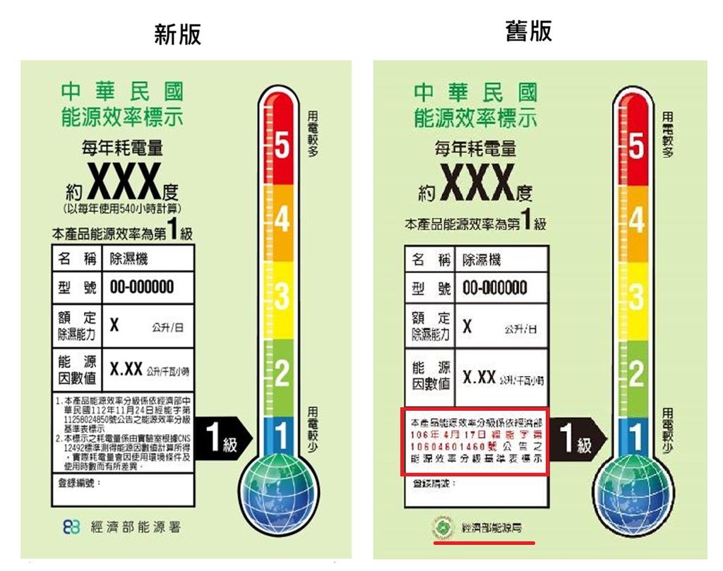 用戶可以藉由能源效率標示辨別除濕機是使用新版或舊版標準。新版能源效率標示的字體為全部黑色、舊版為部分紅色,且新版能源效率標示將註記「經濟部能源署」而非過往的「經濟部能源局」。用戶也可以前往經濟部能源署網站查詢該機種的能源效率等級。