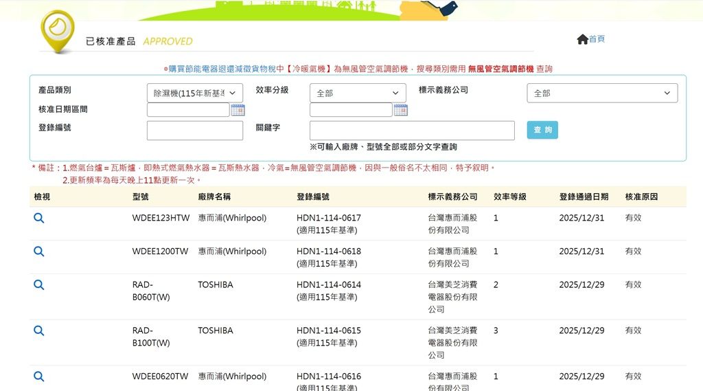 ▲在購買除濕機後,可以前往財政部網站線上申請補助。過往申請補助須要使用自然人憑證,如今只要通過電子信箱驗證即可。貨物稅補助措施將延長實施至2029年12月31日。圖片來源 ▲除濕機貨物稅退稅補助申請頁面採一頁式設計,申請人只要依序填寫申請人資料、除濕機資料,並上傳購買證明照片即可。圖片來源 ▲如果擔心購買到不符合規定的產品,用戶也可以前往經濟部能源局網站查詢除濕機型號和新制能源效率等級,僅1級、2級能源效率機種可申請補助。圖片來源