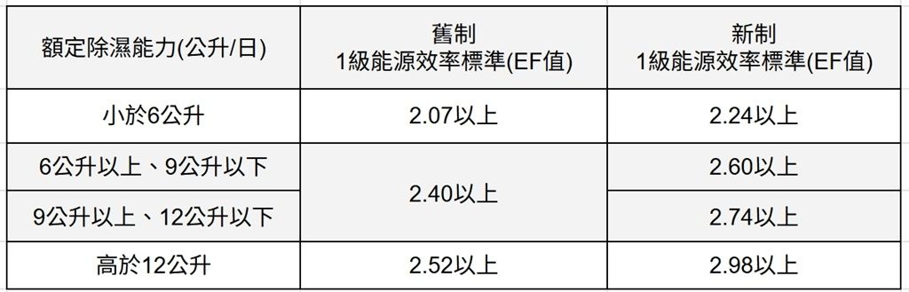 考量到能源效率標準沿用已久,市面上多數產品都能夠符合1級或2級能源效率標準,經濟部推動除濕機能源效率新制,並於2026年1月1日起實施。在除濕機能源效率新制實施後,過往符合1級或2級能源效率的機種可能會變成2級或3級能源效率,用戶務必確認除濕機是符合新制或舊制標準,以免買到不符合補助資格的產品。