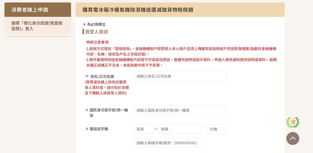 在購買符合能源效率1級、2級的除濕機後,用戶可以前往財政部「購買電冰箱冷暖氣機除濕機退還減徵貨物稅稅額」頁面線上申請補助,依據除濕機機種可申請最低500元、最高1200元補助額度。
