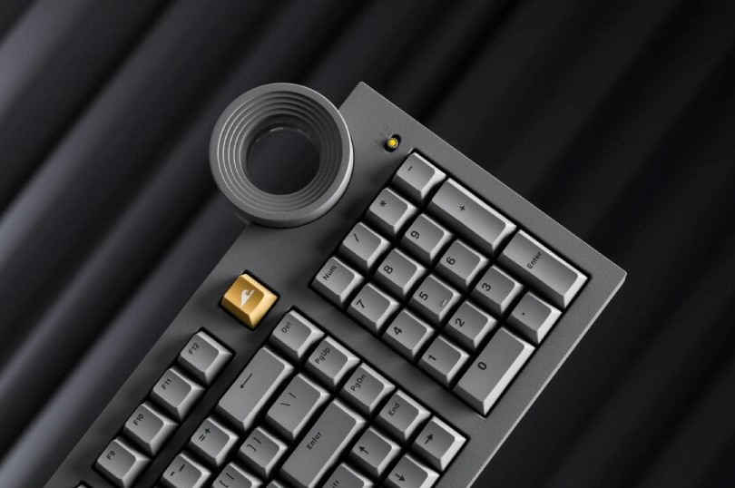 鍵盤最顯眼的地方自然是右上方直徑約 6 公分的大型圓環。這個圓環內部採五段階梯式下凹設計,並嵌入了 LED 燈條,重現光之教堂內部的十字光影與層次感。圓環外圈同時具備旋鈕功能,可用於調整音量或系統操作,並附帶燈光反饋與大小寫狀態指示。