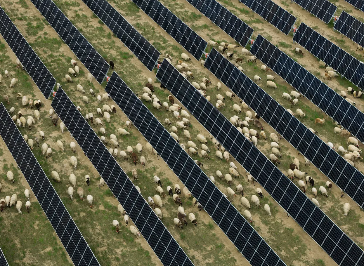 照片涵蓋內蒙古、青海、甘肅、浙江、貴州等地,展示山地、沙漠與沿海地區的太陽能光伏板與風力發電機群。從高空看,太陽能板排列整齊呈幾何圖案,風力渦輪機規律分布,形成獨特的景觀。部分地區的照片還捕捉到太陽能板間吃草的羊群,從地面上很難體會這些發電廠的規模。