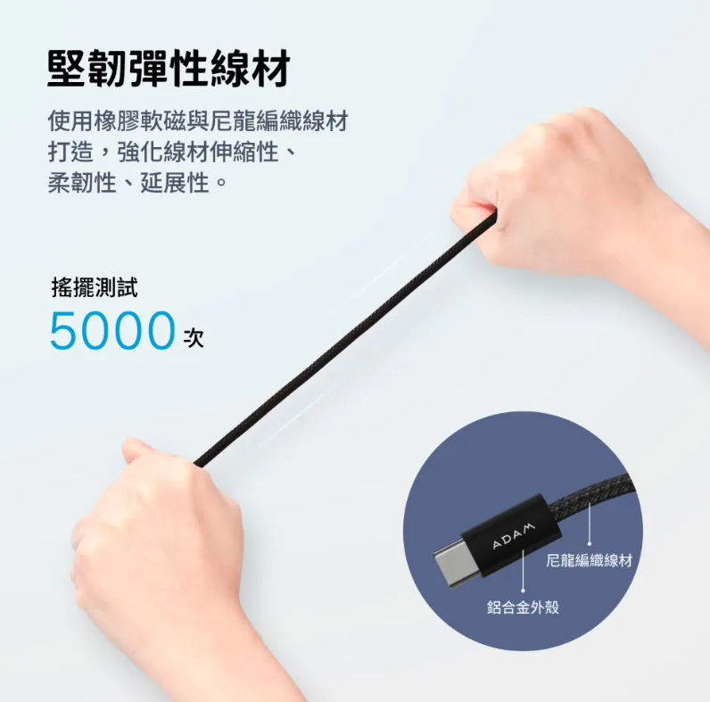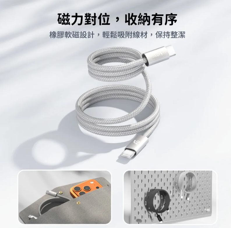 這款充電線最大特色在於磁吸設計能讓線材自然對位收納,並可吸附於金屬洞洞板上。線材為橡膠軟磁與尼龍編織而成,在柔軟度與耐用度上有一定的強度,並經過5000次的搖擺測試。