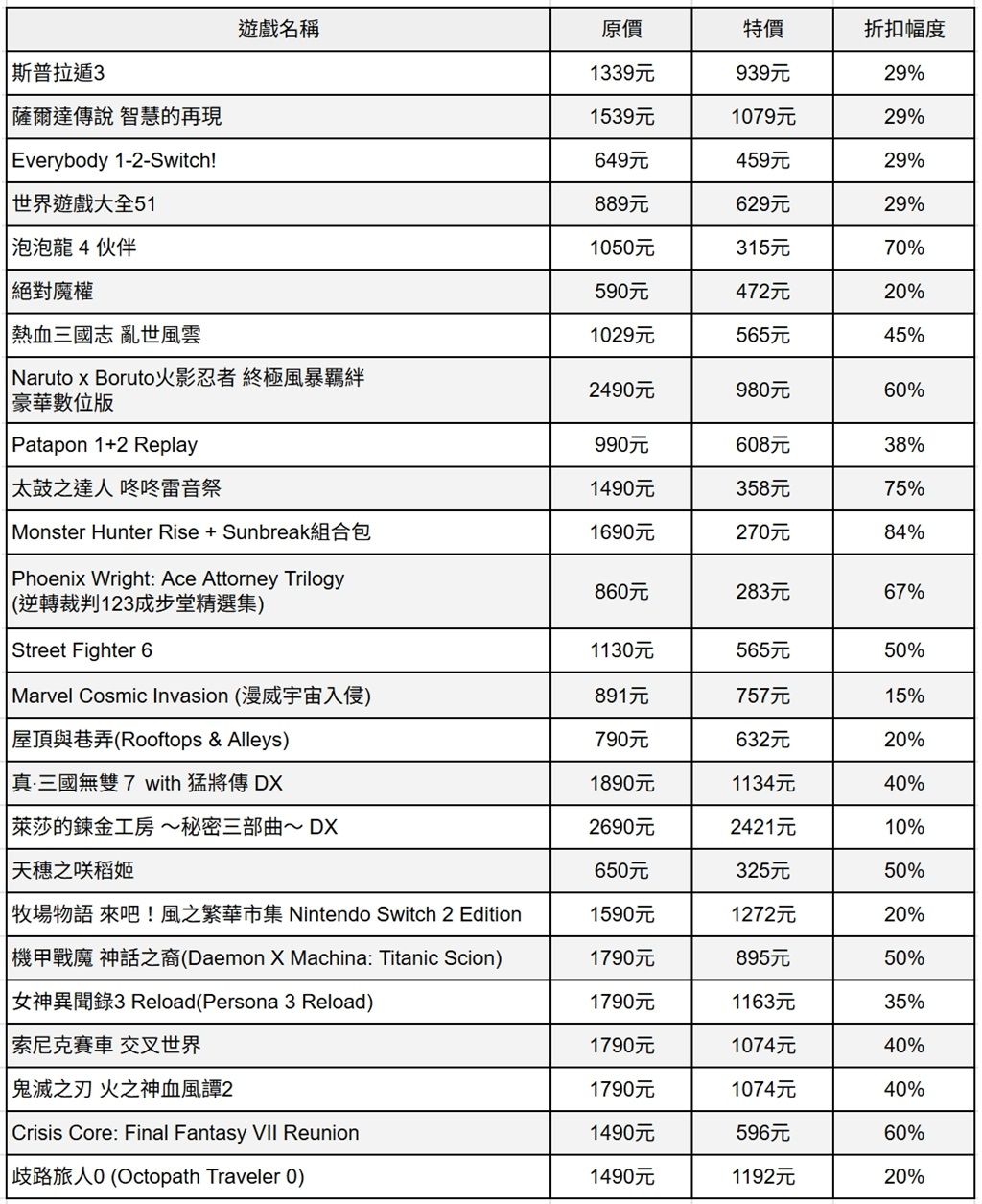 本次任天堂台灣eShop推出25款遊戲特價優惠,知名遊戲包括斯普拉遁3、薩爾達傳說智慧的再現、Everybody 1-2-Switch!、世界遊戲大全51等都有29%的折扣幅度。而在任天堂旗下遊戲以外,也有不少第三方品牌遊戲參與本次活動,例如女神異聞錄3 Reload折扣幅度為35%、Crisis Core: Final Fantasy VII Reunion有60%折扣幅度,另外魔物獵人系列Monster Hunter Rise+Sunbreak組合包本次推出84%的折扣幅度,為本次活動中最多。