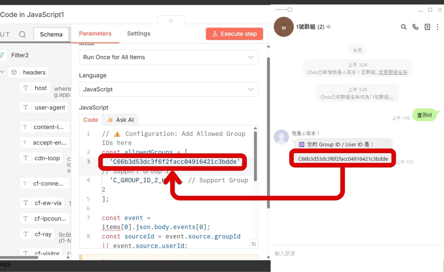步驟 5:為了讓語音轉譯功能僅在特定群組運作,請將程式碼編輯區內容更改為群組過濾邏輯。