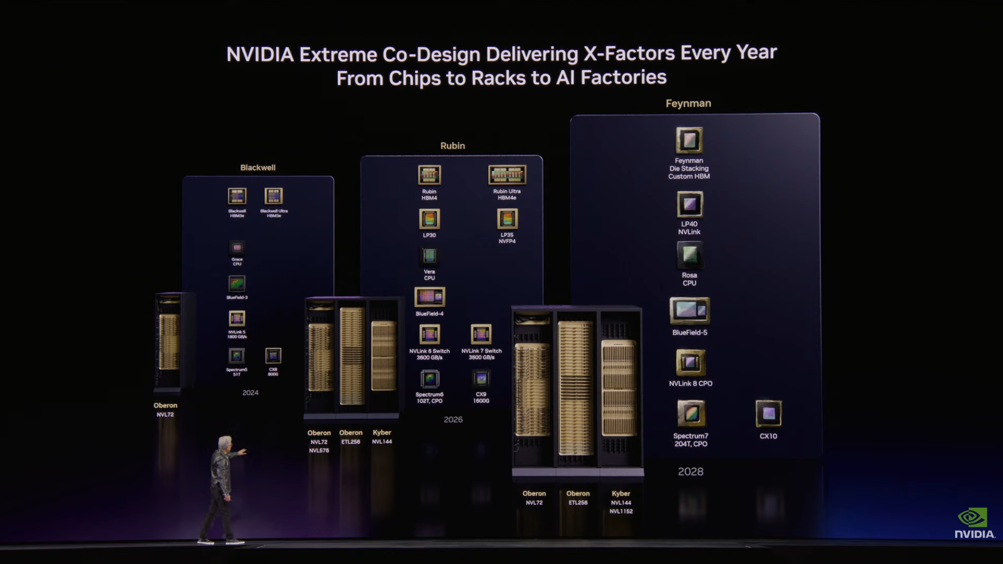 今天大會上,不僅展示了 Vera Rubin,還首度拿出了採用全新垂直插拔設計、搭配 Kyber 機架的下一代運算節點 Rubin Ultra。這項全新的硬體與中介板(midplane)設計,讓系統能在單一 NVLink 內串連高達 144 個 GPU,形成龐大的算力規模。